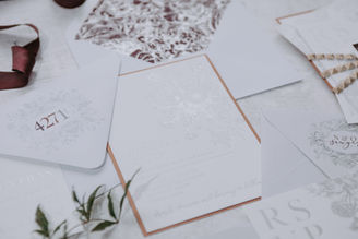 The suite features sketched foil stamped florals, bold and modern typography with sleek layouts and elegant fonts